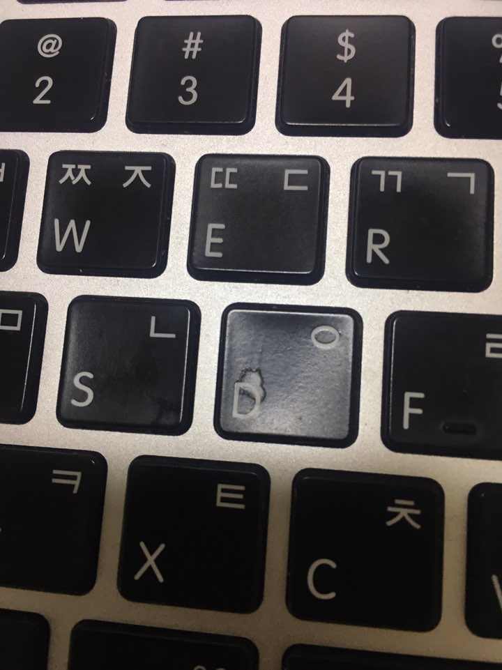 외관은 사진에 올린곳들 살짝 눌림 한개와 찍힌자국 작게 두군데있구요 키보드 d키가 살짝 벗겨진것처럼 바래져있습니다.