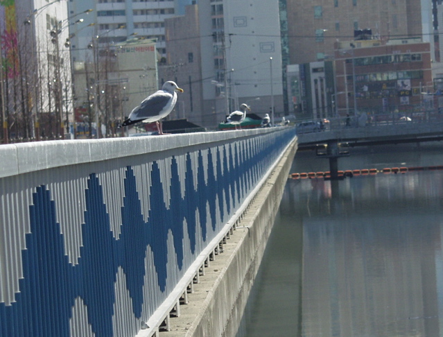 똥천을 사랑하는 갈매기가 난간에서 쉬고 있네요.