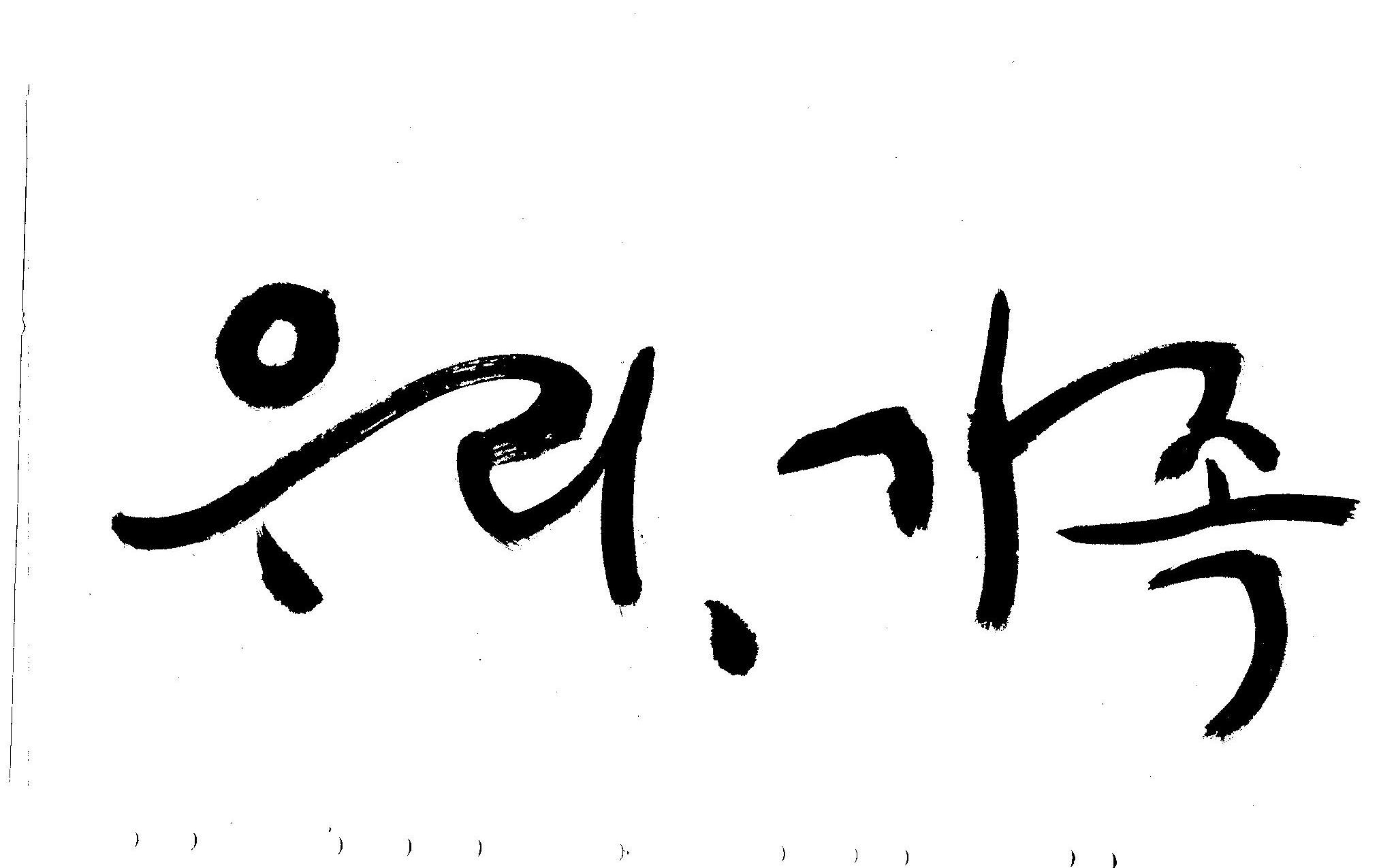 기축년 신년 으뜸말 휘호 김철호 일반 0 4666 2009.01.02 20:21 어떤 으뜸말이 올해엔 필요할까... 고민하다가.. 언제나 그랬듯이 어려울때에는 무엇보다도 우리라는 공동체의 가치관이 더 필요할것 같고 가족이라는 최소의 가치가 (여기서 최소라고 하는것은 가치를 말하는 것이 아니고 가장기본적인 단위를 말하는 것입니다.) 무엇보다도 앞서야 한다고 느꼈으므로 "우리"와 "가족"을 주제어로 정했습니다. 이것은 무조건 내 생각입니다. 다른분들은 다른 주제어가 있겠죠... 어쨌든지 ... 새해엔 행복하고 건강하세요..