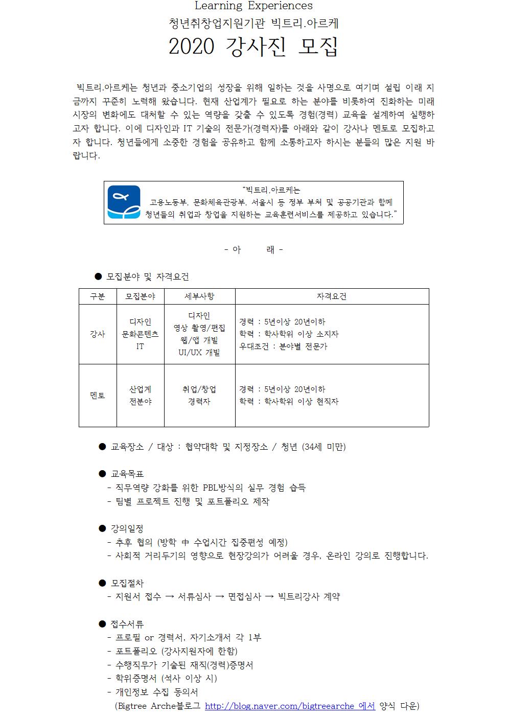 청년취창업지원기관 빅트리.아르케에서 2020년 강사진을 모집합니다.